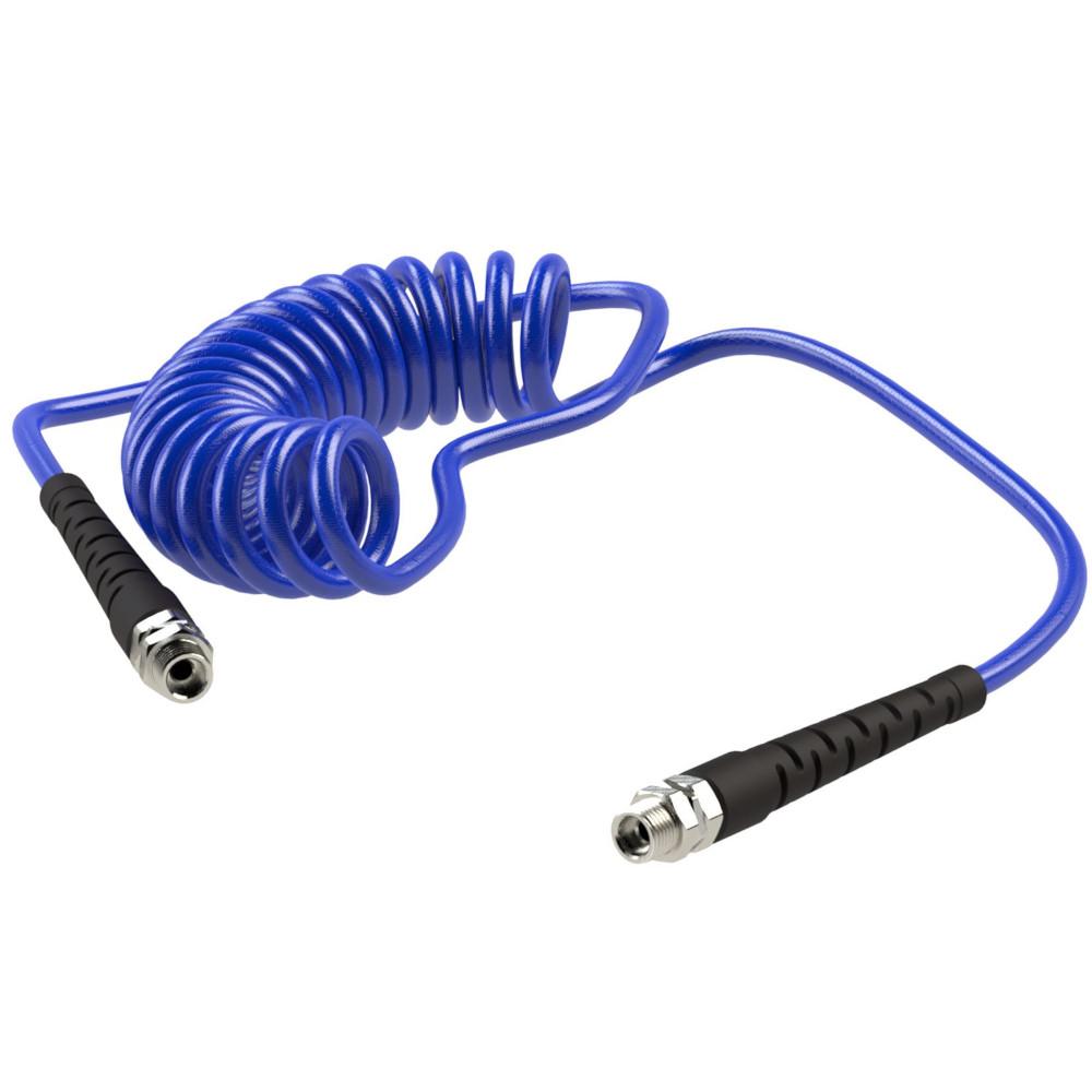 • Der Spiralschlauch ist ein hochflexibler Druckluftschlauch aus Polyurethan (PU) mit drehbaren Gewindeanschlüssen nach G und integrierter Knickschutzfeder für eine sichere Schlauchführung.