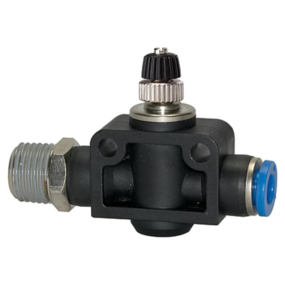 - Das Drosselrückschlagventil eignet sich zur Regelung der Luftströmung in Pneumatikanwendungen bei gleichzeitigem Rückflussstopp.