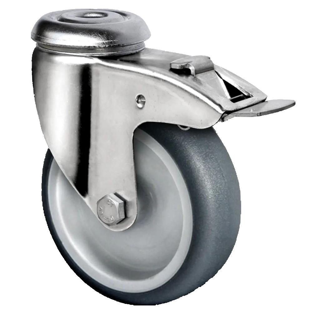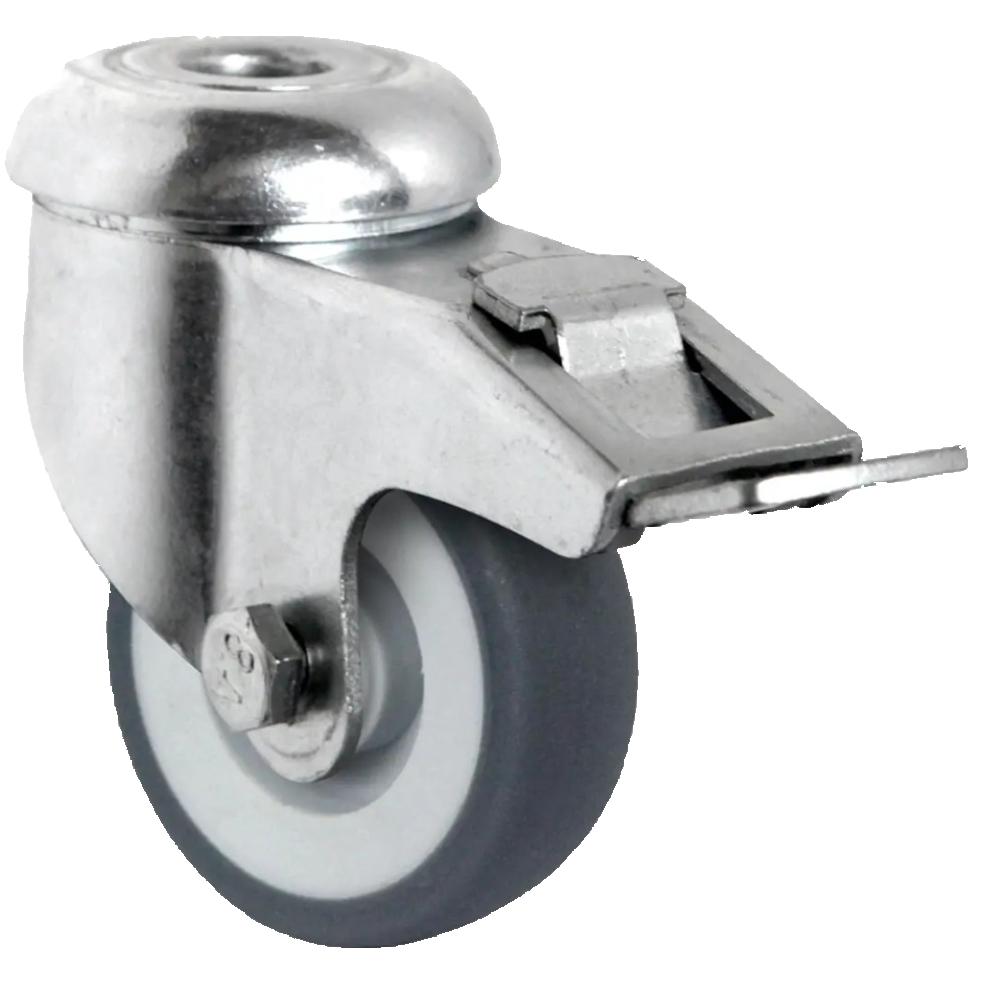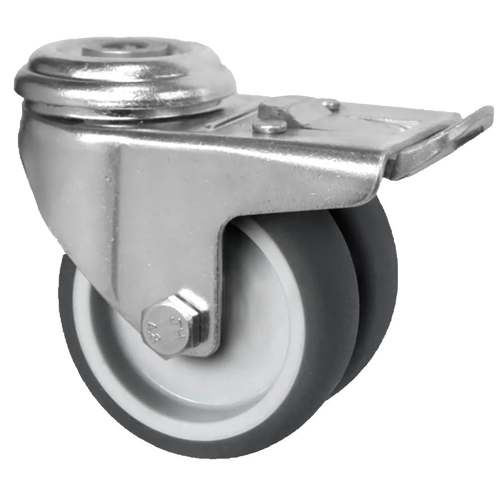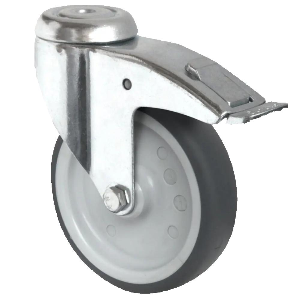 - Die Rückenlochlenkrolle mit Totalfeststeller ist eine Transportrolle mit einem Radkörper aus grauem Polypropylen und einer thermoplastischen Elastomer-Lauffläche mit 95 Shore A in grauer Ausführung, erhältlich in Durchmessern von 50 bis 125 mm sowie Radbreiten von 19 bis 32 mm.