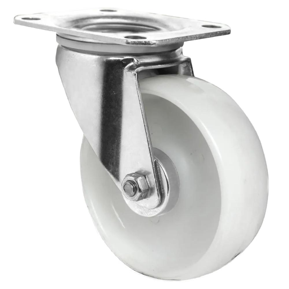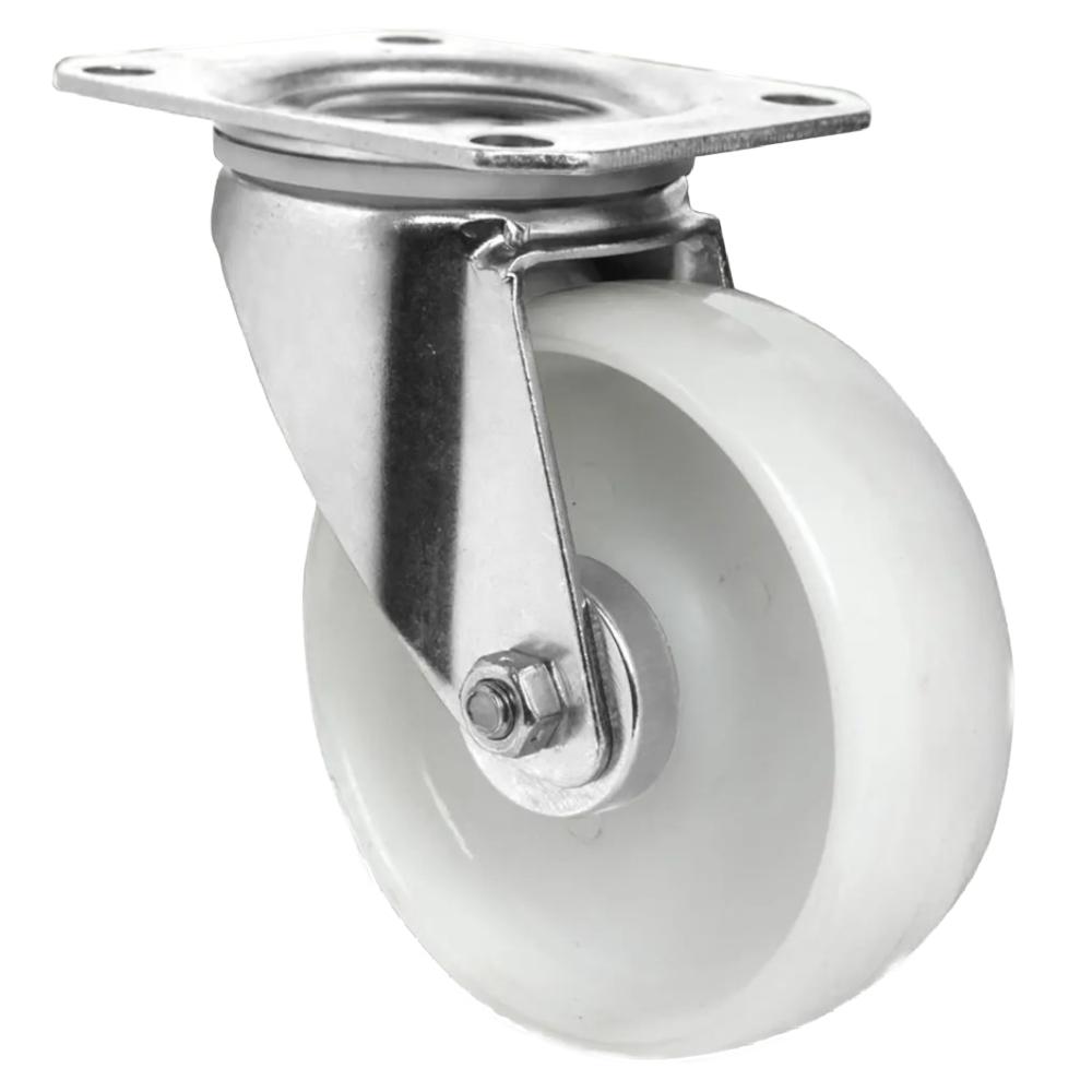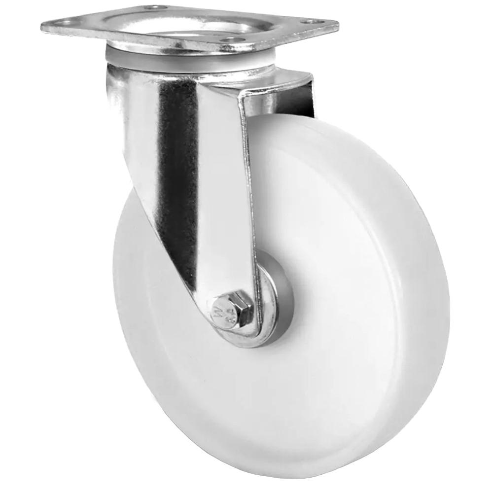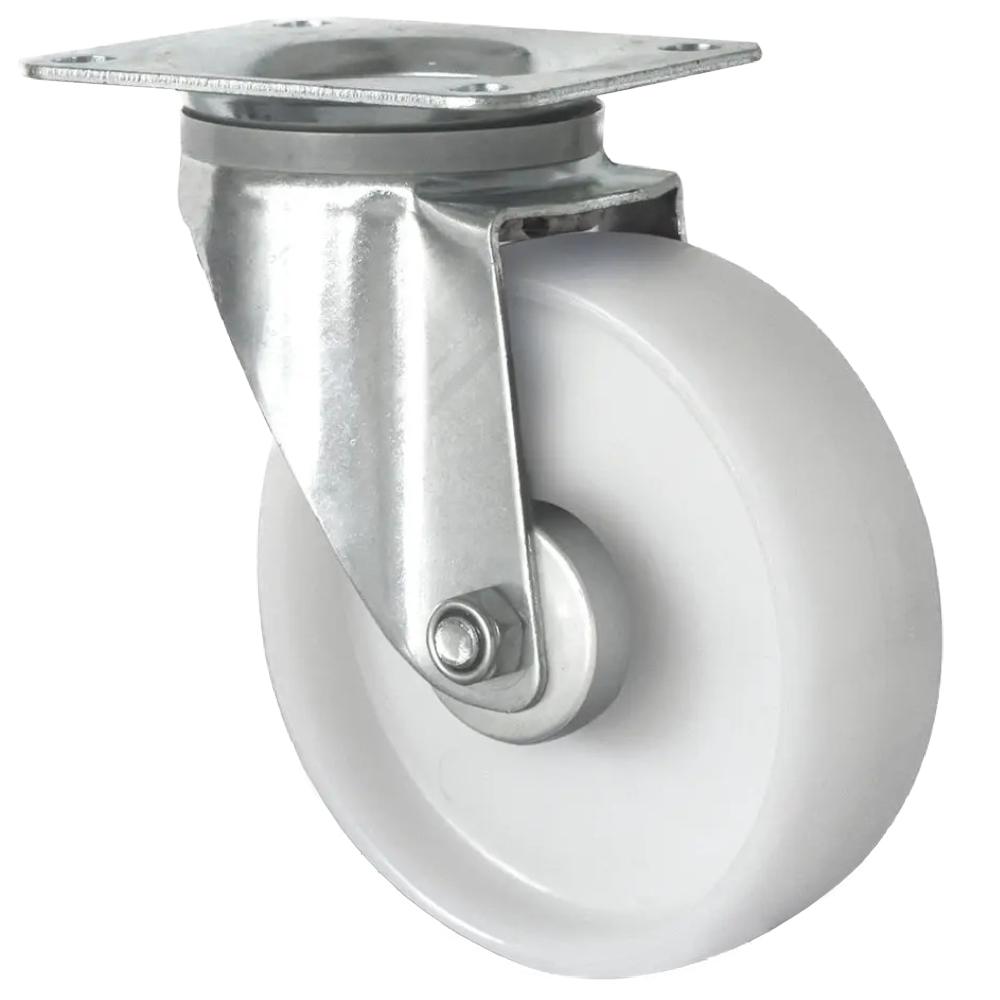 - Die Lenkrolle ist eine leichte bis mittelschwere Transportrolle aus weißem Polypropylen mit Rollenlager und galvanisch verzinktem Stahlblechgehäuse mit zweifachem Kugel-Drehkranz.