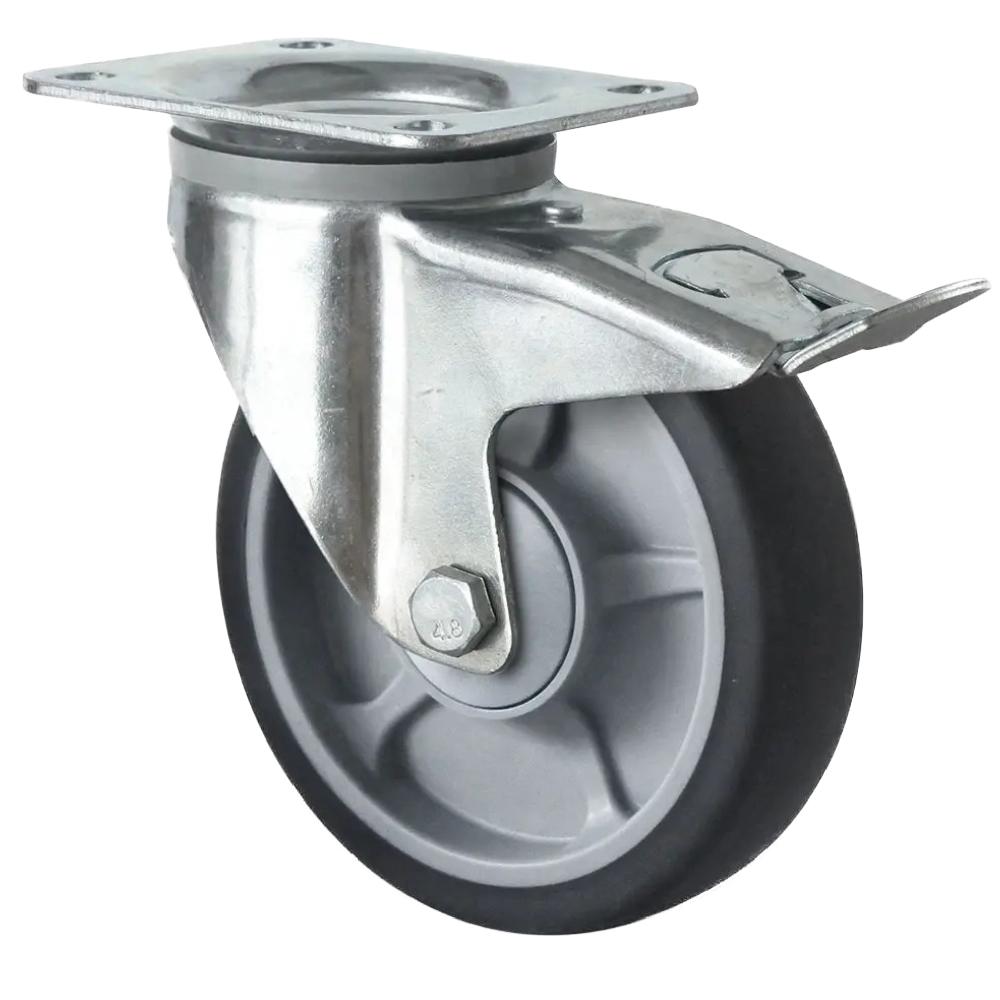 • Die Lenkrolle mit Totalfeststeller ist eine robuste Transportrolle mit einem Radkörper aus grauem Polypropylen und einer elastischen Lauffläche aus thermoplastischem Elastomer (65 bis 75° Shore A) sowie einem verzinkten Stahlblechgehäuse.