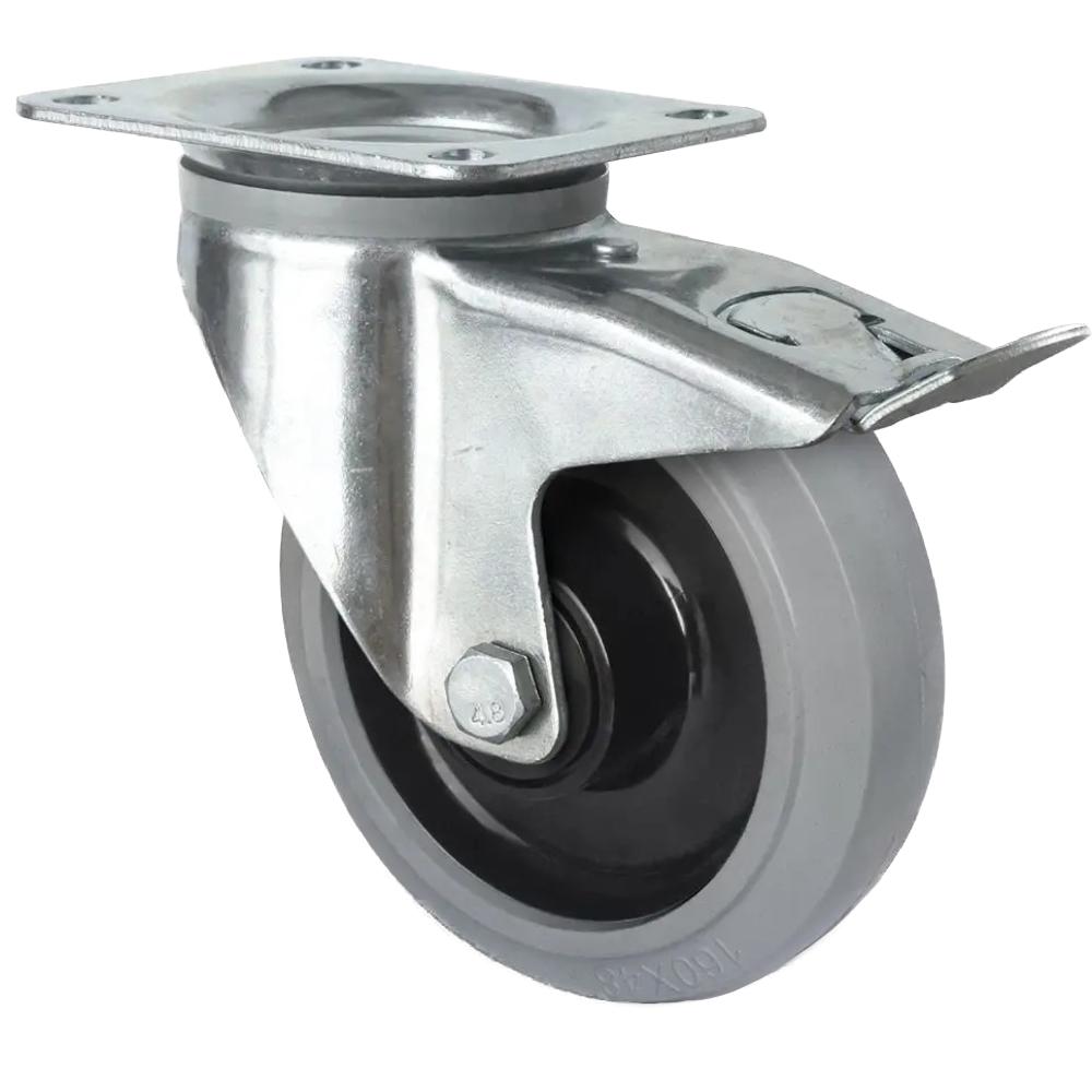 - Die Lenkrolle mit Totalfeststeller ist eine robuste Schwerlastrolle mit einem Radkörper aus schwarzem Polyamid und einer elastischen Lauffläche aus Elastik (65° Shore A) in grau sowie einem verzinkten Stahlblechgehäuse.
