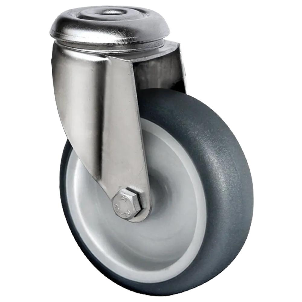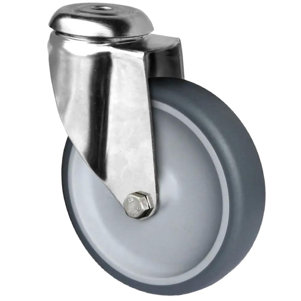 - Die Rückenloch-Lenkrolle besteht aus einem Rad mit Radkörper aus grauem Polypropylen und einer grauen Lauffläche aus thermoplastischem Elastomer mit einer Härte von 95° Shore A.