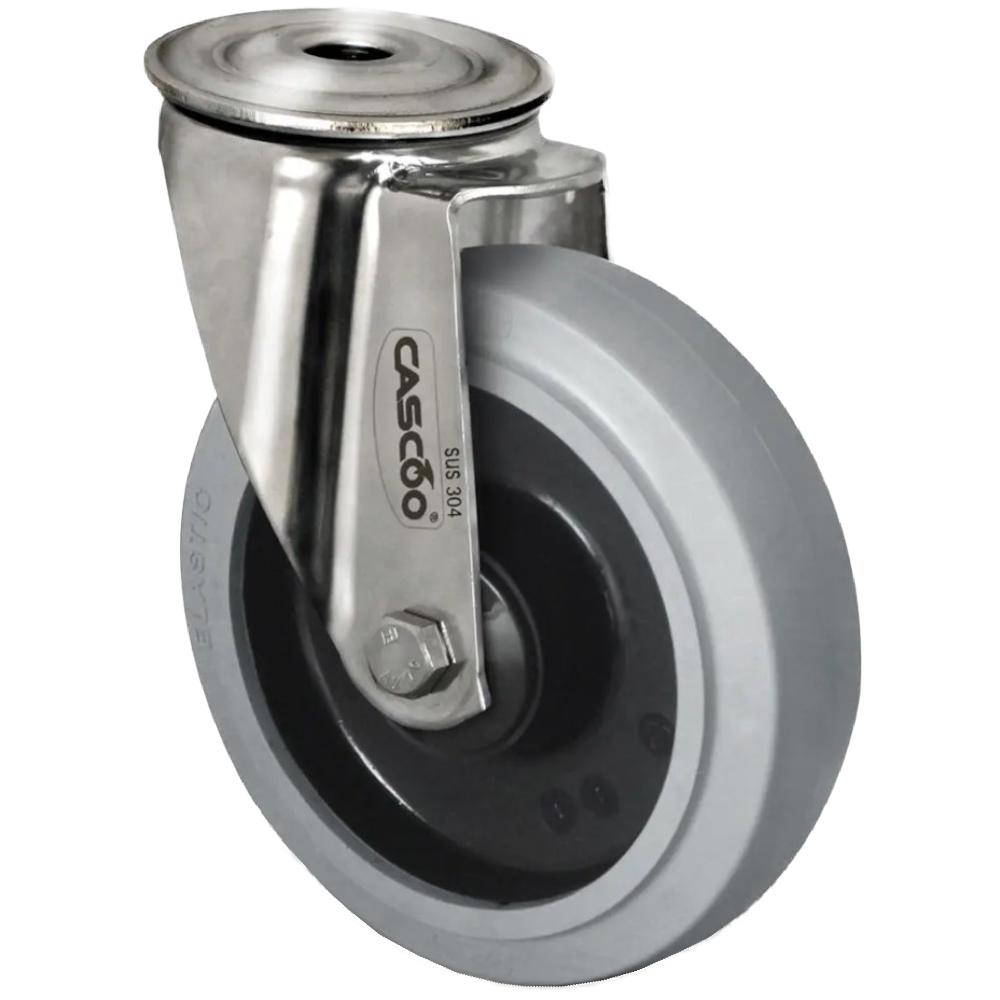 - Die Rückenloch-Lenkrolle besteht aus einem Rad mit Radkörper aus schwarzem Polyamid und einer grauen Elastik-Lauffläche mit einer Härte von 65° Shore A.
