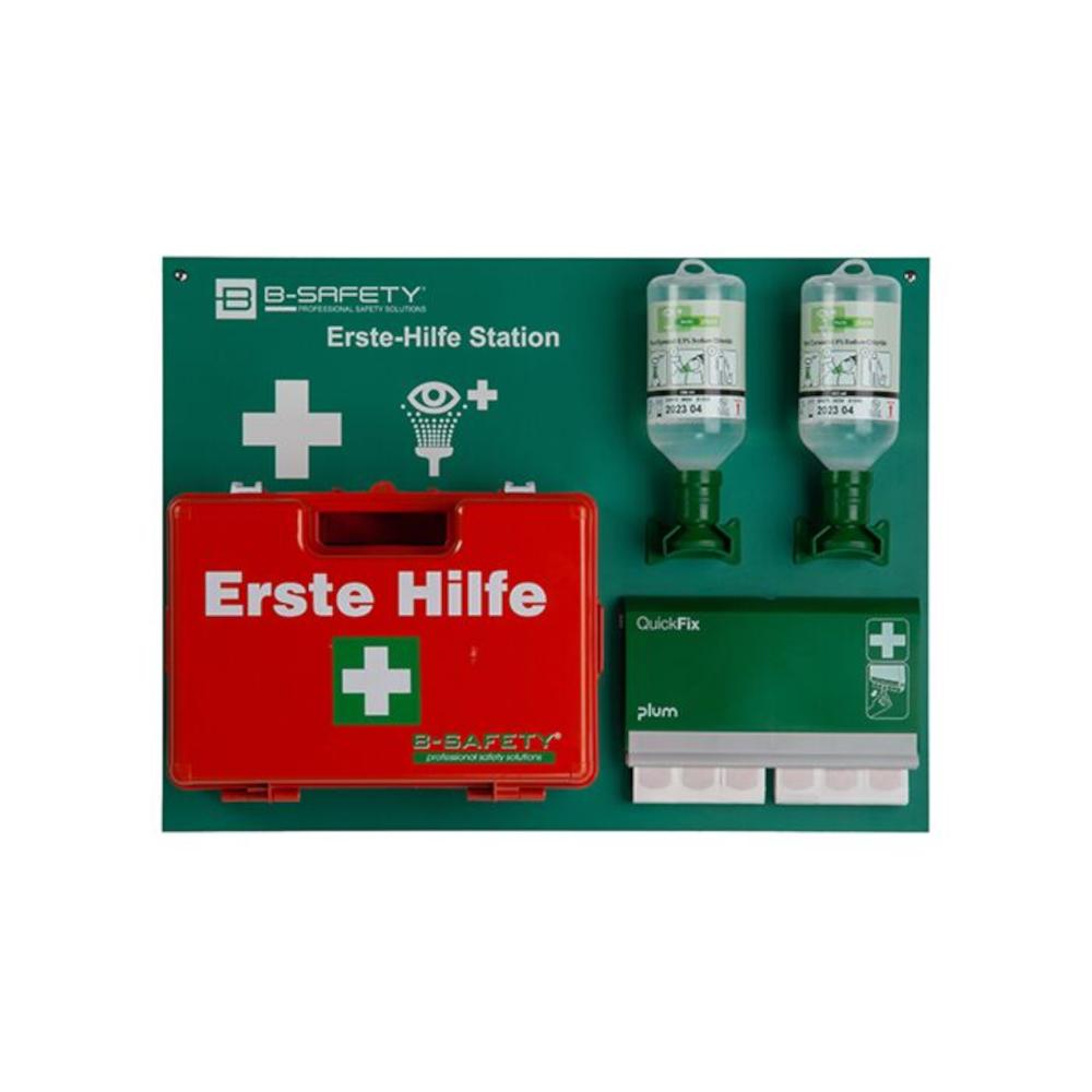 - Die Station enthält u. a. einen voll ausgestatteten Erste-Hilfe-Koffer CLASSIC nach DIN 13157, einen QuickFix Pflasterspender DUO mit textilen und wasserfesten Pflastern sowie Augenspülflaschen zur Erstversorgung von Augenverletzungen.