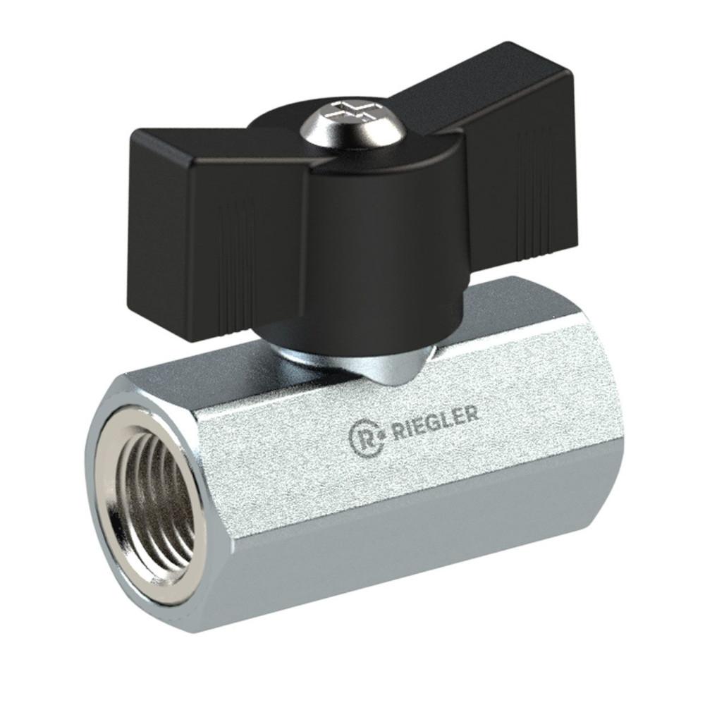 - Der Mini-Kugelhahn ist eine kompakte Absperrarmatur aus vernickeltem Messing mit Flügelgriff und beidseitigem Innengewinde nach G.