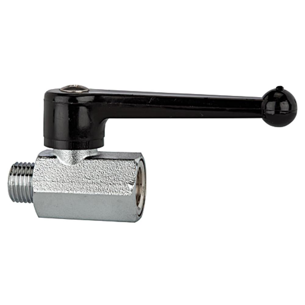 - Der Mini-Kugelhahn ist eine kompakte Absperrarmatur aus vernickeltem Messing mit griffigem Handhebel und Innengewinde/Außengewinde-Anschluss nach G.