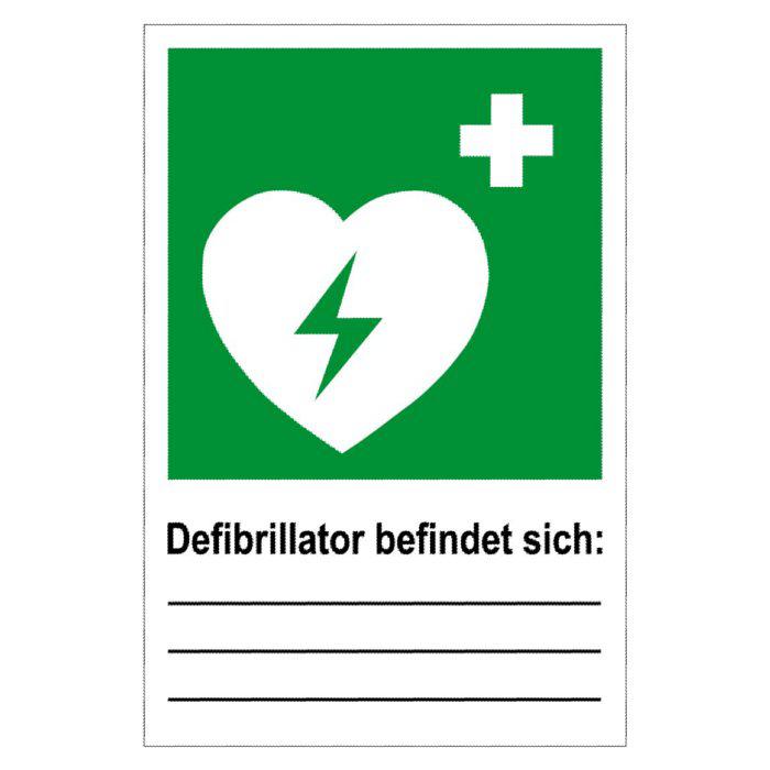 - das Rettungszeichen "Defibrillator befindet sich:" ist im Innen- und Außenbereich einsetzbar