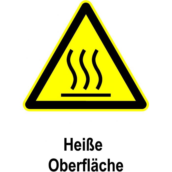 - das Warnschild "Vorsicht! Heiße Oberfläche" ist im Innen- und Außenbereich einsetzbar